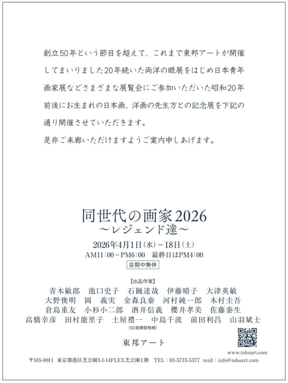 創立50年という節目を超えて、これまで東邦アートが開催してまいりました20年続いた両洋の眼展をはじめ日本青年画家展などさまざまな展覧会にご参加いただいた昭和20年前後にお生まれの日本画、洋画の先生方との記念展を下記の通り開催させていただきます。